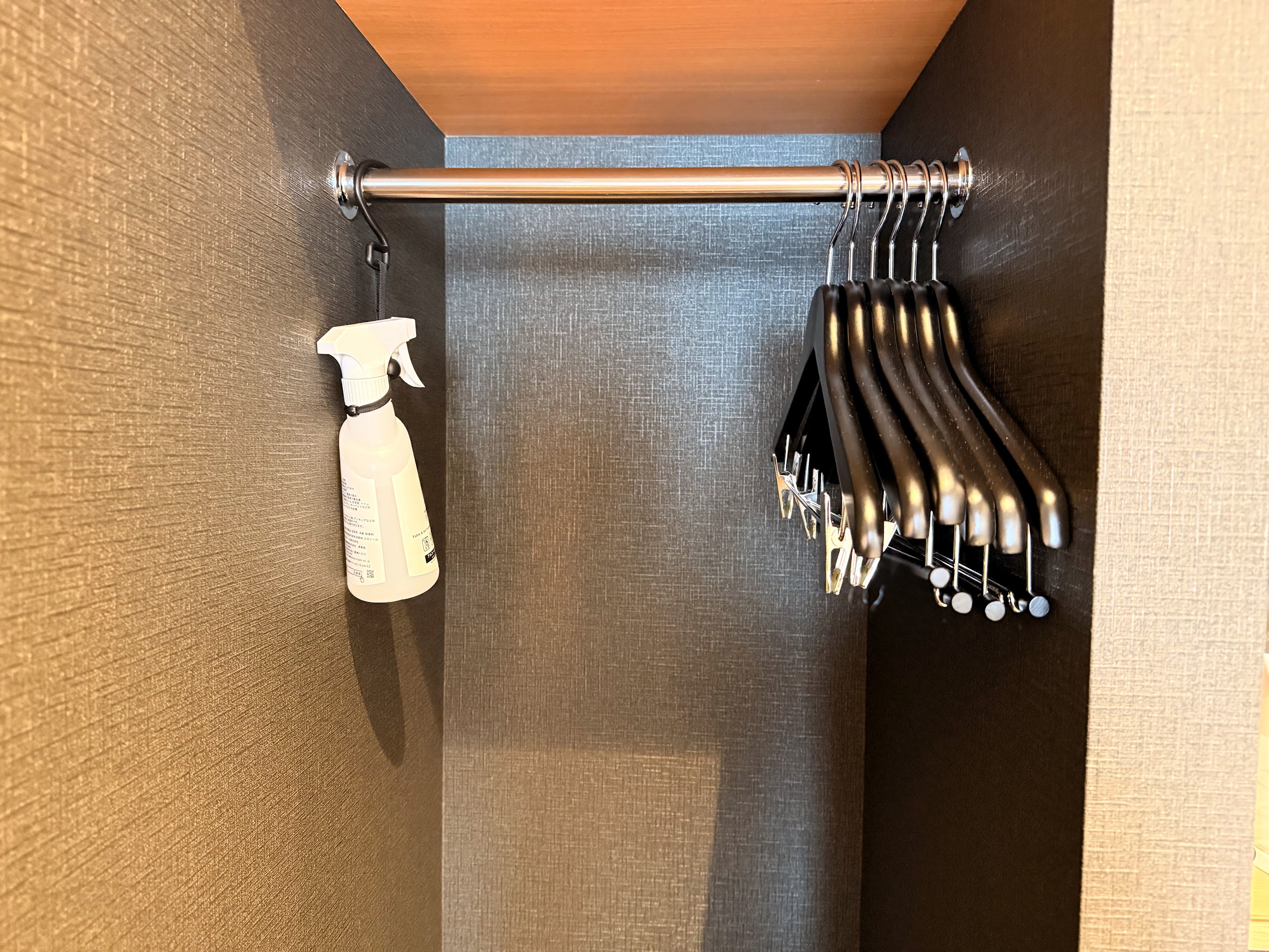 また部屋の右手奥にはハンガーが置いてあるので、スーツやコート類をかけられます。消臭用スプレーも完備。
