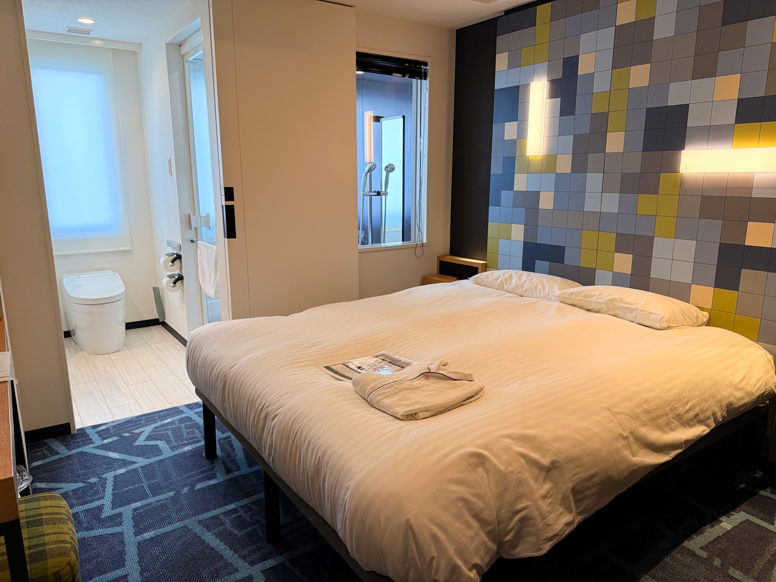 今回宿泊したのはスーペリアダブル ステーションサイドのお部屋です。部屋にはダブルサイズのベットの他に、テーブルや椅子も置いてありました。秋葉原らしいポップカルチャーや電気街をイメージしたデザインで、洗練された印象の空間です。
