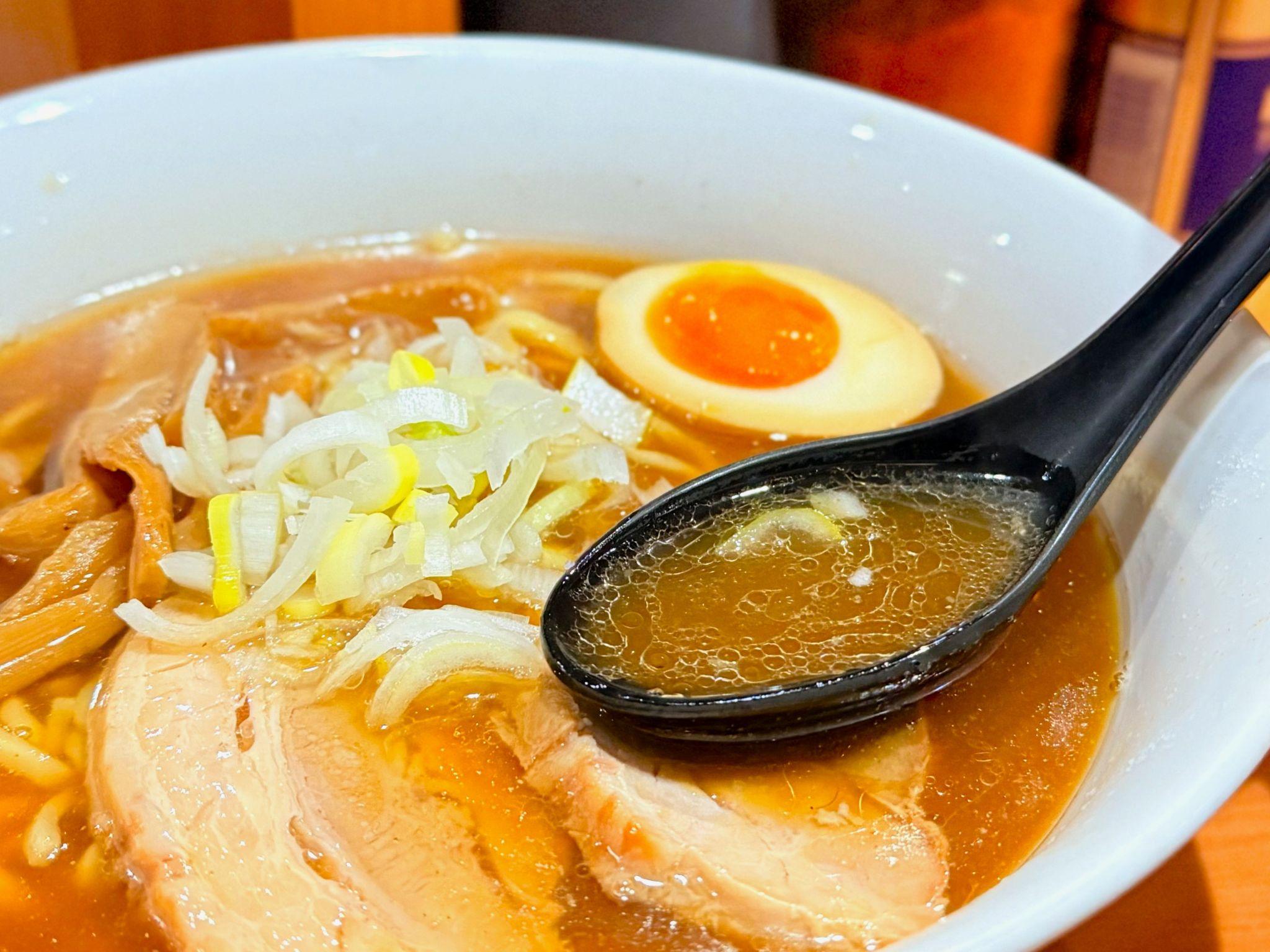 スープは魚介系の風味が香る醤油ベースです。しっかりとしたコクのある濃いめでありつつも、塩気が主張しすぎない食べやすさを感じられました。